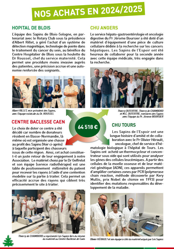 Au fil des ans, un formidable réseau s’est tissé autour de cette action et les résultats obtenus sont extraordinaires : en 29 années de fonctionnement, les Sapins ont collecté plus de 1,6 Million € dédiés à l’achat de matériel à des équipes médicales de soin et de recherche avec un principe incontournable : aucune remise d’argent, c’est l’association elle-même qui achète le matériel.